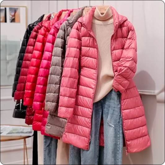 Daunenjacken für Damen, langer, ultraleichter, legerer, gesteppter, taillierter Mantel mit Kapuze